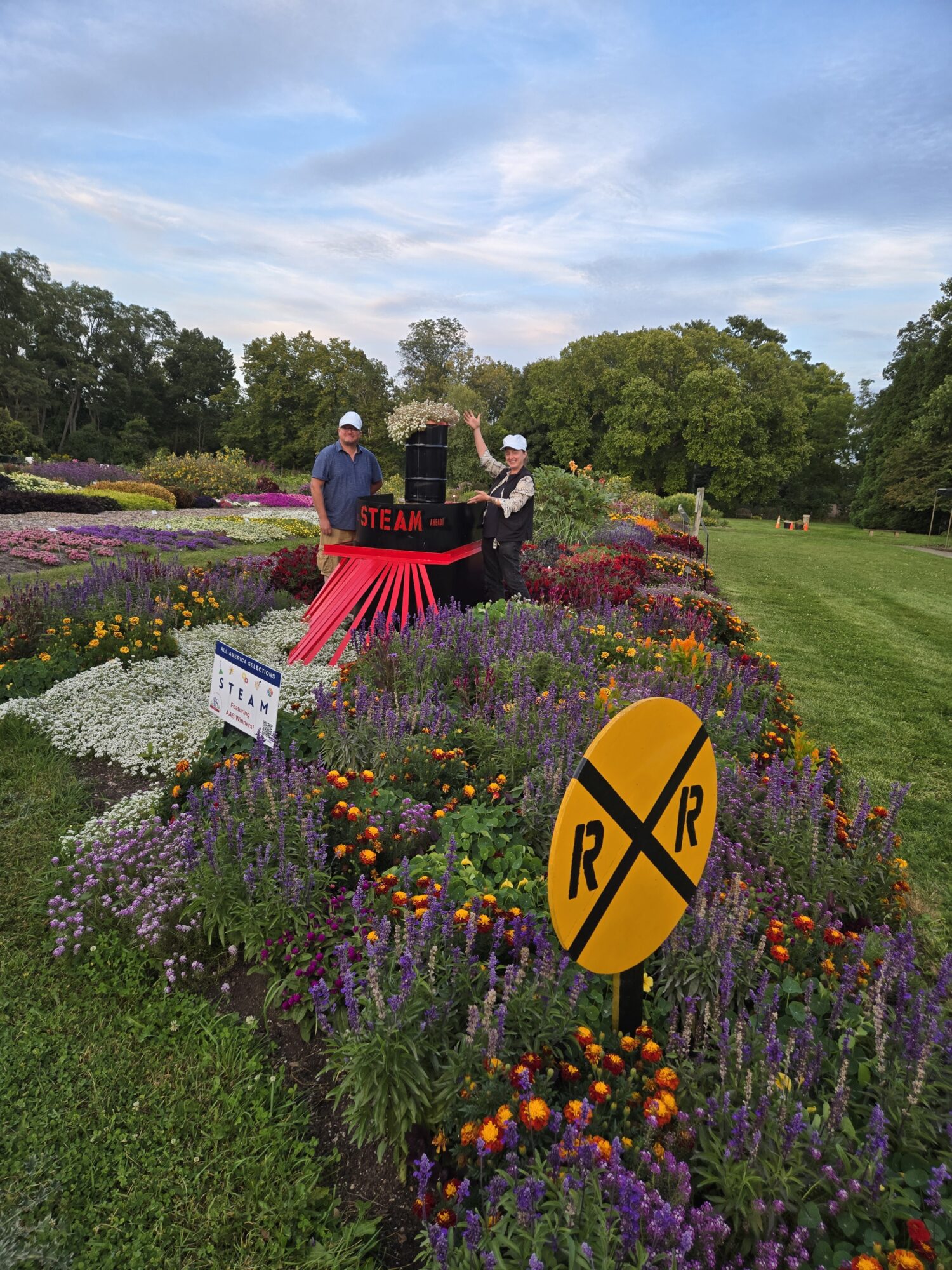 The trial garden display at Boerner Botanical Gardens featured a distinctive STEAM train built to reflect the 2025 AAS theme. Using the long bed, the designer constructed a train with each “car” representing a different STEAM discipline, planted exclusively with past and present AAS Winners. The project incorporated a unique train engine and cow catcher built from scrap metal by an Ironworkers Local 8 member. Educational efforts included information cards linking plants to each STEAM concept for visiting school groups. The display proved highly popular, serving as a photo opportunity and educational focal point for both school children and general visitors, generating local news coverage and social media interest.